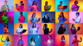 Nowoczesne technologie. Kolaż dużej grupy zróżnicowanych etnicznie ludzi, mężczyzn i kobiet korzystających z różnych gadżetów na kolorowym tle w świetle neonowym. Koncepcja online, młodzieży, hobby, internetu, reklamy