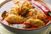 Malvani Masala pikantne curry z kurczaka z kokosowym zbliżeniem na misce na stole. Poziomy widok z góry z góry