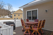 Deski pokładowe ganku z białymi balustradami w domu przedmieścia