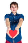 Miłość i Walentynki piękna brunetka trzymając w ręce na białym tle czerwone serce
