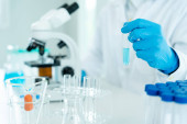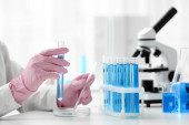 Ręce młodej badaczki w płaszczu, dodające kilka kropli płynnej substancji na małym szkle podczas eksperymentu naukowego