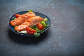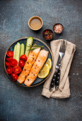 Grillowany stek łososiowy z sałatką warzywną na ceramicznym talerzu na rustykalnym kamiennym tle widok, zrównoważona dieta lub zdrowe odżywianie sałatka z łososia i warzyw