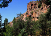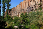 Majestatyczne skały i zielony las w wąwozie w Dolinie Ihlara w środkowej Anatolii, Kapadocja, Turcja