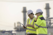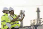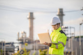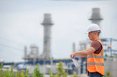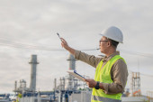Zdjęcie "Azjata inżynier petrochemiczny pracujący w fabryce rafinerii ropy naftowej i gazu, ludzie robotnik inżynier pracy kontroli w energetyce przemysłu wytwórczego" może być wykorzystywane do celów osobistych i komercyjnych zgodnie z warunkami zakupionej licencji Royalty-free. Obraz jest dostępny do pobrania w jakości wysokiej rozdzielczości do 5760x3840.