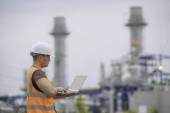 Grupa Azjatycki człowiek petrochemiczny inżynier pracujący w fabryce przemysłu rafinerii ropy naftowej i gazu, Ludzie robotnik inżynier pracy kontroli w energetyce przemysłu energetycznego