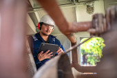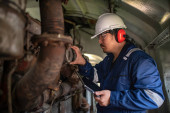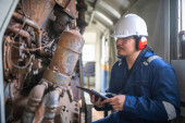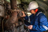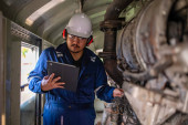 Zdjęcie "Inżynier silnika inspekcji dużych maszyn w fabryce, Technik utrzymania silnika kolejowego, Naprawa silnika kierownik mechaniczny" może być wykorzystywane do celów osobistych i komercyjnych zgodnie z warunkami zakupionej licencji Royalty-free. Obraz jest dostępny do pobrania w jakości wysokiej rozdzielczości do 5760x3840.