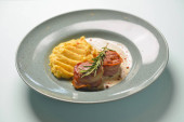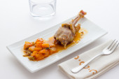 Schab wieprzowy z sosem serowym i marchewką.