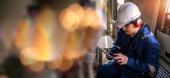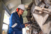 Zdjęcie "Inżynier silnika inspekcji dużych maszyn w fabryce, Technik utrzymania silnika kolejowego, Naprawa silnika kierownik mechaniczny" może być wykorzystywane do celów osobistych i komercyjnych zgodnie z warunkami zakupionej licencji Royalty-free. Obraz jest dostępny do pobrania w jakości wysokiej rozdzielczości do 5760x3840.