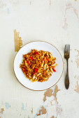 Pieczony makaron z żeberkami wieprzowymi, kiełbaskami i pomidorami. Tradycyjne hiszpańskie tapa.