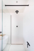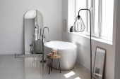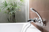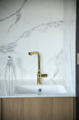 Selektywne ujęcie ostrości nowoczesnego zlewozmywaka z białymi płytkami