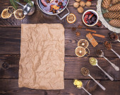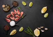 Różne plastry cytryny i limonki na drewnianej desce. Sól, przyprawy i rozmaryn gałęzie na czarnym tle, widok z góry