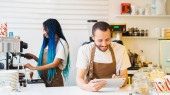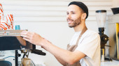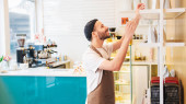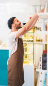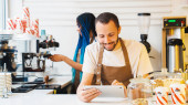 Uśmiechnięty barista czyta etykietę na opakowaniu ziaren kawy stojąc przy stojaku. Biznes restauracja żywności i napojów koncepcja