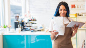 Zdjęcie "Uśmiechnięty barista czyta etykietę na opakowaniu ziaren kawy stojąc przy stojaku. Biznes restauracja żywności i napojów koncepcja" może być wykorzystywane do celów osobistych i komercyjnych zgodnie z warunkami zakupionej licencji Royalty-free. Obraz jest dostępny do pobrania w jakości wysokiej rozdzielczości do 5760x3840.