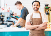 Zdjęcie "Widok z boku szczęśliwy profesjonalny barista przygotowuje zamówienie klienta, robiąc filiżankę kawy w kawiarni. Mały biznes kawy" może być wykorzystywane do celów osobistych i komercyjnych zgodnie z warunkami zakupionej licencji Royalty-free. Obraz jest dostępny do pobrania w jakości wysokiej rozdzielczości do 5760x3840.