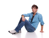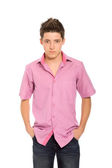 młody człowiek w niebieskie dżinsy i koszulę. łapka na biały.