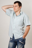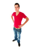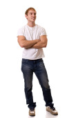 młody człowiek w niebieskie dżinsy i koszulę. łapka na biały.