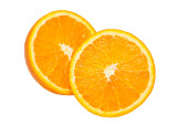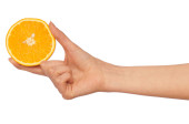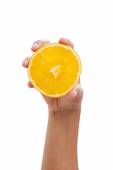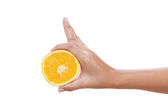 Kobiece ręki trzymającej plasterek pomarańczy, na białym tle