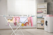 Laundry basket filled with clothes on table in bathroom