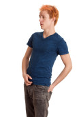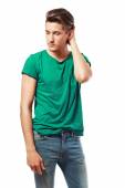 młody człowiek w niebieską koszulę. łapka na biały.