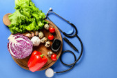 Zdjęcie "Top widok zdrowej żywności w płycie ze stetoskopem, diety cholesterolu i kontroli cukrzycy na białym tle. Światowy Dzień Zdrowia i koncepcja medyczna. Panorama." może być wykorzystywane do celów osobistych i komercyjnych zgodnie z warunkami zakupionej licencji Royalty-free. Obraz jest dostępny do pobrania w jakości wysokiej rozdzielczości do 5760x3840.