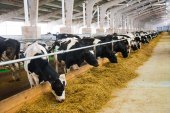 Stado krów stojących za zagrodą dla zwierząt i jedzących siano w dużym gospodarstwie