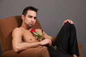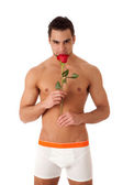 mężczyzna atrakcyjny w bielizna z jedną czerwoną różą.
