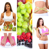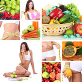 Piękna młoda kobieta z jabłek i pomidorów w ręce na białym tle na biały, pomidory i jabłka wokół