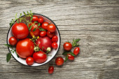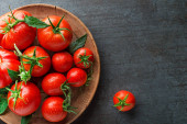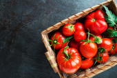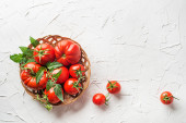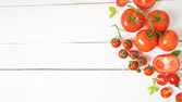 Świeże pomidory na białym tle stołu. Zbieram pomidory. Gotowanie zdrowego posiłku.