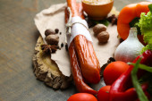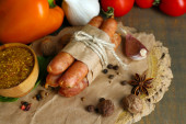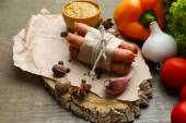 Kompozycja z cienkiej kiełbasy, musztarda w misce i przyprawy na drewniane tła