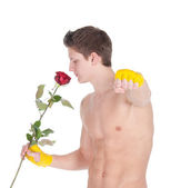 mężczyzna atrakcyjny w bielizna z jedną czerwoną różą.