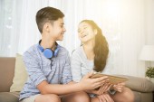 Młody mężczyzna pomaga dziewczynie założyć nowe trampki, które zamówiła online
