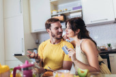 Uśmiechnięta młoda kobieta daje kartę kredytową mężowi i prosi o zamówienie ulubionego jedzenia na obiad