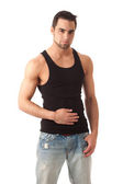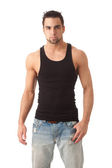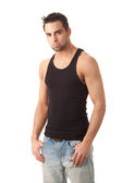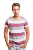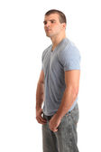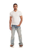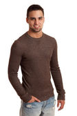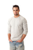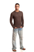 młody człowiek w sweter i dżinsy. łapka na biały.