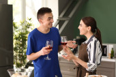 rozradowany brodaty mężczyzna opierający się na rudym chłopaku podczas brzęczenia kieliszków do wina w kuchni, baner