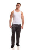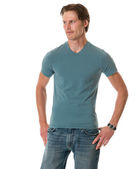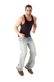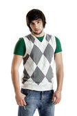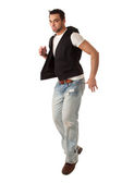 młody człowiek w dżinsy i kamizelki. łapka na biały.