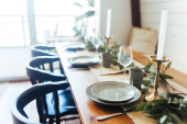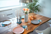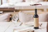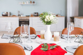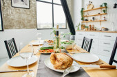 butelka i kieliszki wina w pobliżu smażonego kurczaka i warzyw serwowane na stole w nowoczesnej kuchni, baner