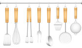 Zestaw naczyń kuchennych do przygotowania ciasta zawieszonego na półce na białym tle. 3d renderowania procesu gotowania krok po kroku i akcesoria do gotowania, mieszania i mieszania