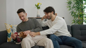 overjoyed ruda człowiek pokazując wow gest w pobliżu gej partner gospodarstwa biżuteria pudełko z obrączka w sypialnia