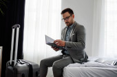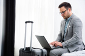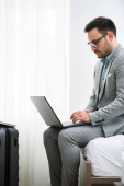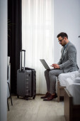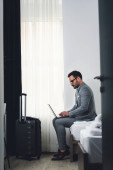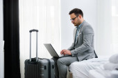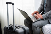 Biznesmen korzystający z laptopa, pracujący w pokoju hotelowym. Podróże służbowe.