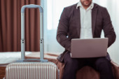 Biznesmen korzystający z laptopa, pracujący w pokoju hotelowym. Podróże służbowe.