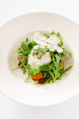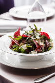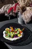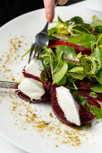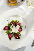 Sałatkę z kilku rodzajów sałaty wymieszać z papryką, karmelizowanymi burakami, gorgonzolą i balsamiką. Jedzenie leży na lekkiej płycie ceramicznej na lekkim obrusze.