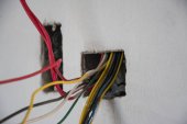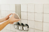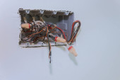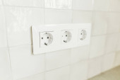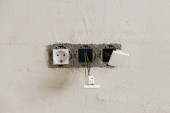 Skrzynka elektryczna z gniazdkiem i przełącznikiem. Instalacja złącza elektrycznego w tynkowanej ścianie. Budowa koncepcji remontu domu i domu. Przewody