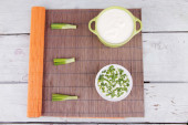 Miska smacznej śmietany z zieloną cebulą na grunge tle