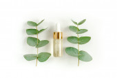Butelka z olejkiem kosmetycznym i gałązką eukaliptusa na białym tle