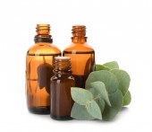 Butelka z olejkiem kosmetycznym, gałązką eukaliptusa i kamieniami na białym tle