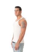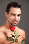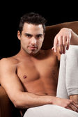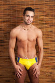 atrakcyjny mężczyzna, półnagi, przed ekranem bambusa.