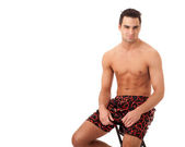 atrakcyjny młody człowiek w strój kąpielowy. łapka na szary.