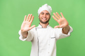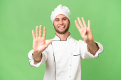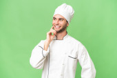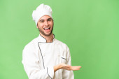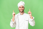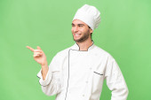 młody przystojny kucharz człowiek na odosobnionym tle wskazując palcem w bok i prezentując produkt