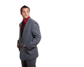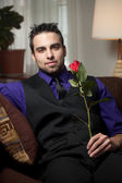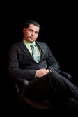 dobrze ubrany mężczyzna w fotelu. łapka na czarno.