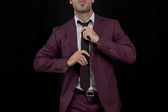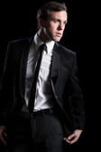 dobrze ubrany mężczyzna w fotelu. łapka na czarno.